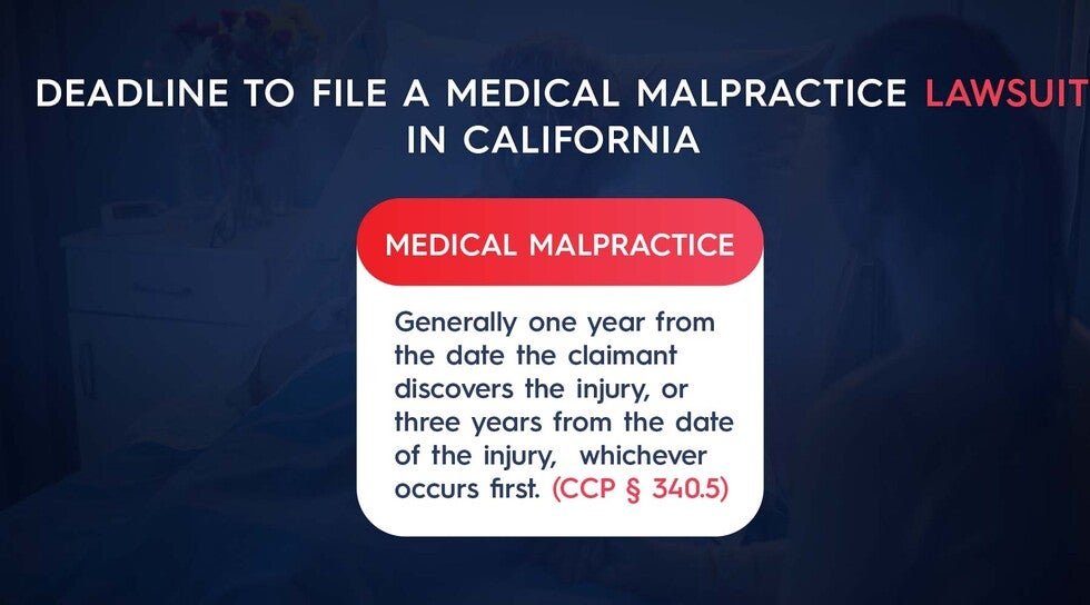 - Medical Malpractice: Generally one year from the date the claimant discovers the injury, or three years from the date of the injury, whichever occurs first (CCP § 340.5).