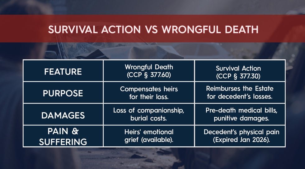 California law distinguishes between economic and non-economic losses. However, it is important to note that as of January 1, 2026, California has reverted to stricter rules regarding “Survival Actions.” While families can still seek compensation for their own loss of love and companionship (Wrongful Death), the ability to claim the deceased person’s pre-death pain and suffering has largely sunsetted for new cases.